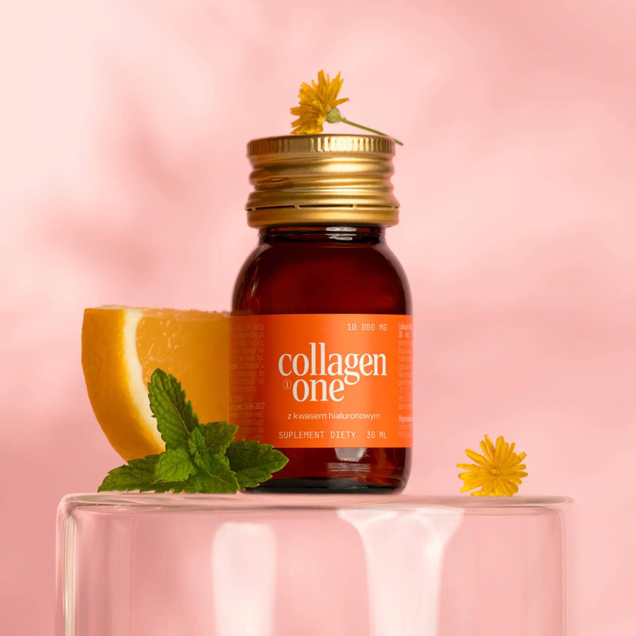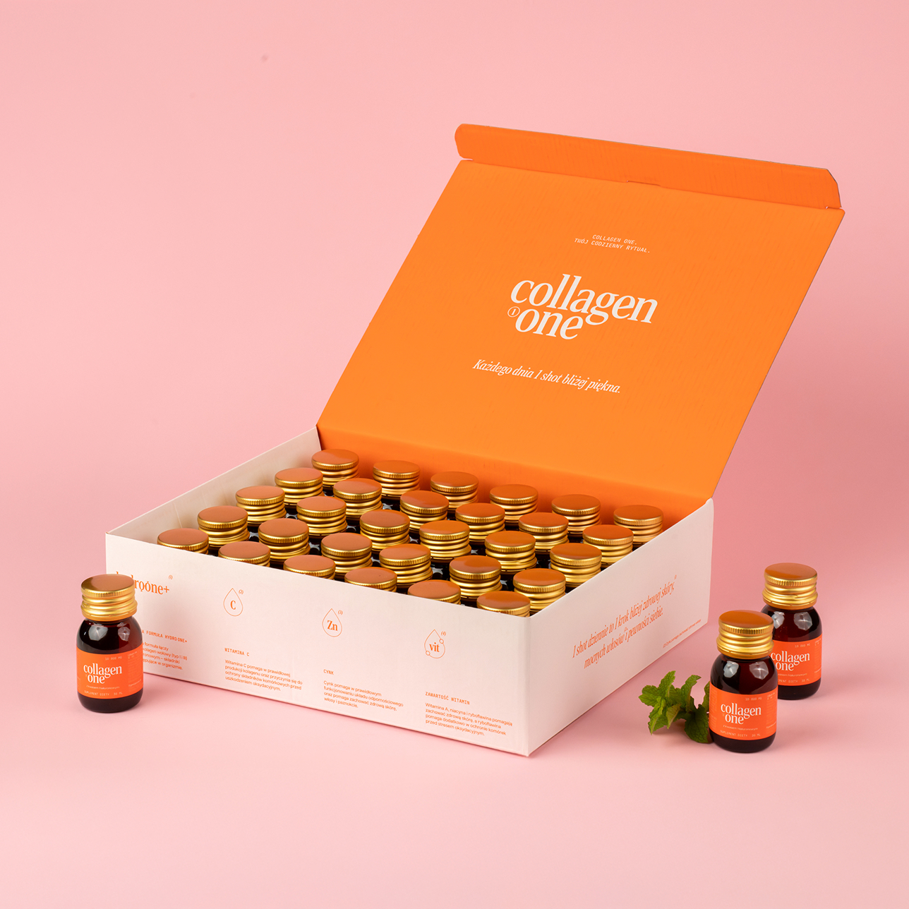 COLLAGEN ONE ist ein Nahrungsergänzungsmittel in Form von trinkfertigen Gläsern, das die einzigartige Formel Hydro One+ enthält. Es ist eine Kombination aus 10.000 mg Rinderkollagen, Hyaluronsäure, Vitamin C, B-Vitaminen, Vitamin A und Zink – Inhaltsstoffen, die zur Erhaltung gesunder Haare, Haut und Nägel (Zink) beitragen und die normale Funktion des Knorpels (Vitamin C) unterstützen.